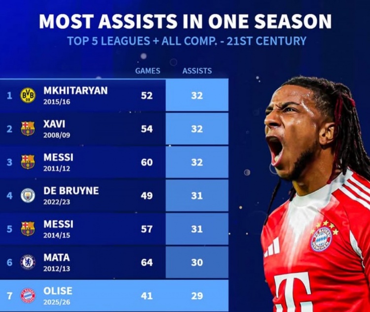 4月11日讯 拜仁在欧冠客场2-1击败皇马,奥利塞送出助攻。《转会市场》统计显示他已经跻身新世纪五大联赛球员单赛季各项赛事助攻榜第7位。